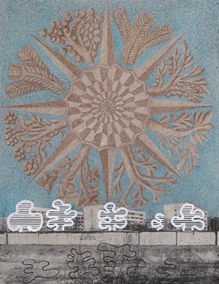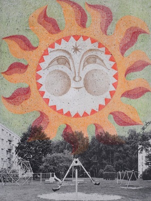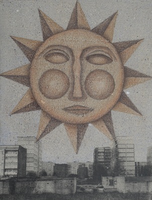 Padomju Latvijas mākslinieku saule (D.Staprēna) 20.gs. 60.- 70. gados virs tipveida ēkām Olainē jaunajā rajonā, 21. gs. 20.gados