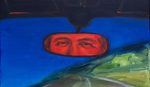 Liekas, izstādes centrālais tēls šeit ir glezna, kur tavs tētis pie stūres raugās atpakaļskata spogulī un mēs saskatāmies ar viņu, it kā sēžot tajā mašīnā. Un izskatās, ka viņš drusku smaida.