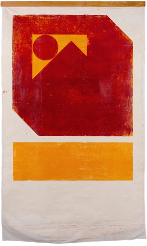 The works are created using a relief printing technique, employing cardboard clichés and alkyd enamel, without the use of a printing press or other tools. Radical simplicity, a laconic colour palette, and a deliberate avoidance of the technical complexities characteristic of printmaking result in the use of primitive forms, large areas of colour, and coarse textures. When printed on fabric, the works acquire a flag-like form, which constitutes a conceptually significant component of the exhibition’s underlying idea” – Paulis Liepa, January 2026.