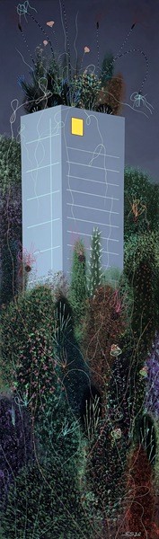 Sandras Strēles tēli un izkoptā krāsas pilinājuma tehnika milzu audeklus ļauj uztvert rotaļīgi un viegli, pat balansējot uz šaurām, garām laipām virs noslēpumainām ūdens dzelmēm. (Ilze Žeivate, 2026.)